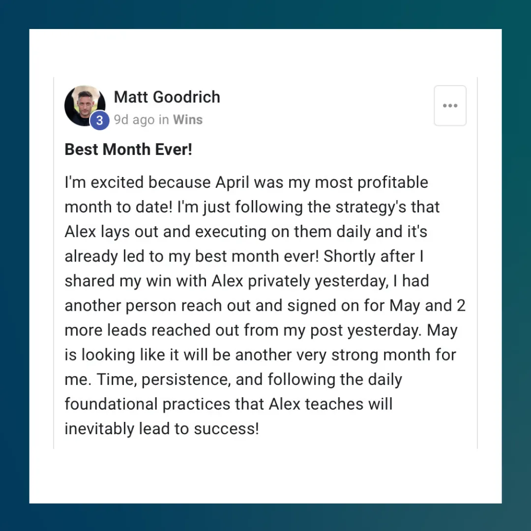 You get new skills, a ton of confidence, and the systems we install mean you can keep growing every month.